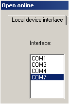 In this example here, the COM7 interface is used. To work with the SIRIUS USB PC cable in SIRIUS ES, select the function Switching device --> Open online and open the tab Local device interfaces and select COM7.