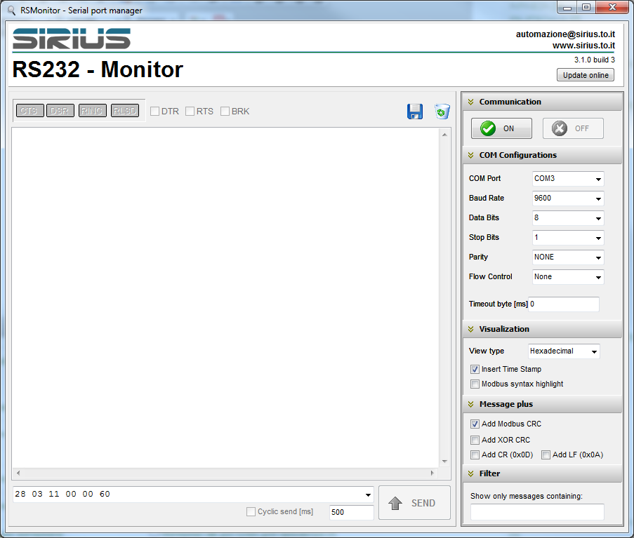 Small and versatile software for PC serial port management, useful for serial communication testing and analysis, especially for MODBUS protocol.