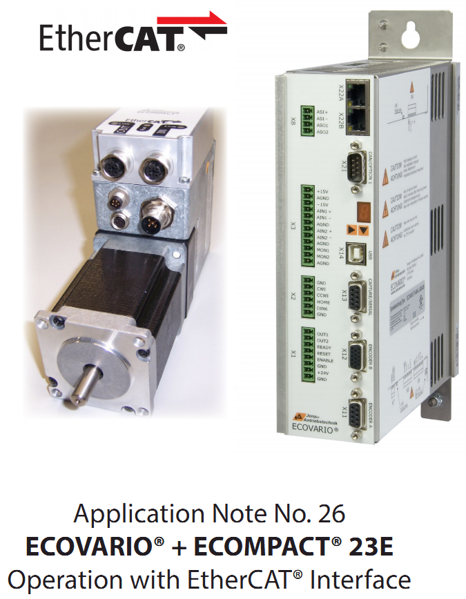 JAT_GmbH_EcoVario.zip (2.2 KB) - ECOVARIO 114/214/414 JAT_GmbH_EcoVario.xml JAT_GmbH_EcoVarioDual.zip (3 KB) - ECOVARIO 114D/616(D) JAT_GmbH_EcoVarioDual.xml JAT_GmbH_ECOMODULx4.zip (49.7 KB) - ECOMODUL 4-axis JAT_GmbH_ECOMODULx4.xml JAT_GmbH_ECOMODULx6.zip (51.2 KB) - ECOMODUL 6-axis JAT_GmbH_ECOMODULx6.xml JAT_GmbH_ECOMODULx8.zip (52.7 KB) - ECOMODUL 8-axis JAT_GmbH_ECOMODULx8.xml JAT_GmbH_Ecompact.zip (1.8 KB) - ECOMPACT JAT_GmbH_Ecompact.xml AN_26_EtherCAT_en.pdf - Application Note No. 26 ECOVARIO® + ECOMPACT® 23E Operation with EtherCAT® Interface | |